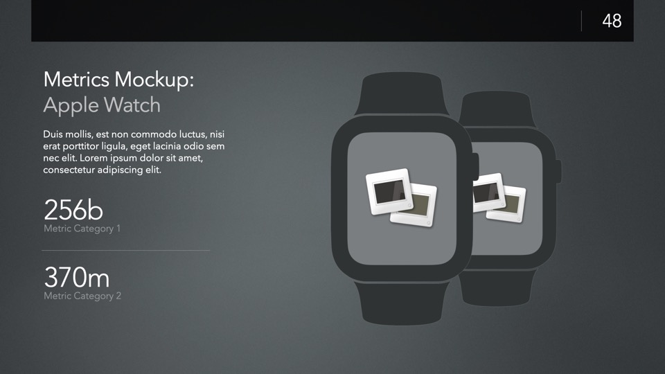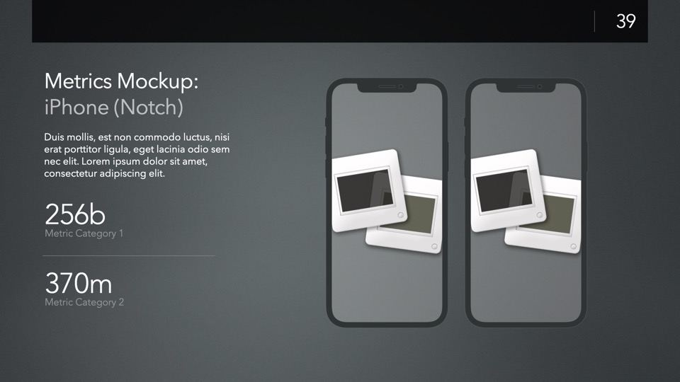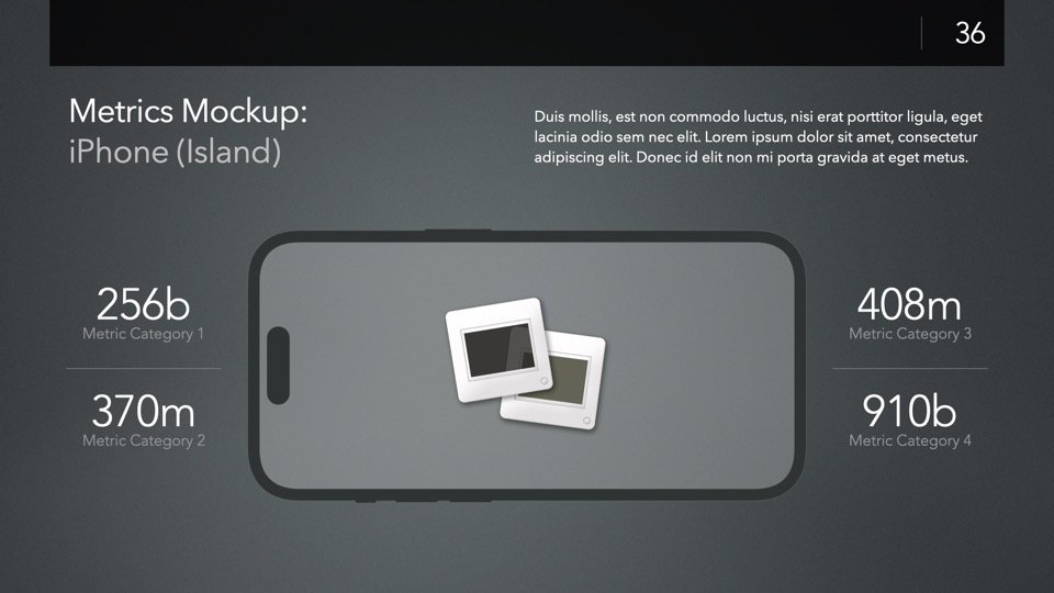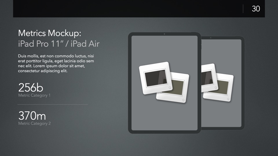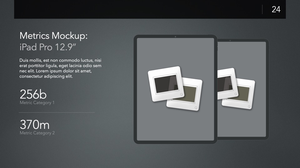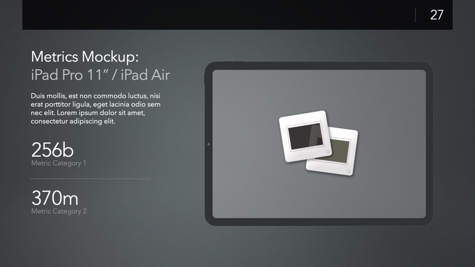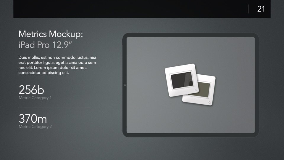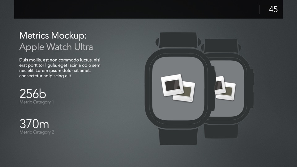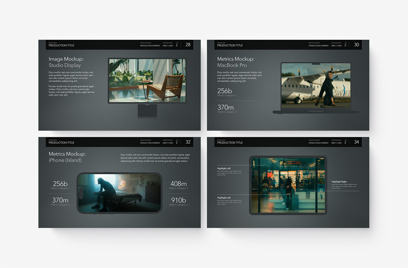 Device Mockup Templates enable you to showcase your apps, concepts, and designs on a range of illustrated Apple-centric hardware, including narrative, metics, and highlight layouts featuring the Studio Display, iMac, MacBooks, iPads, iPhones and Apple Watches.