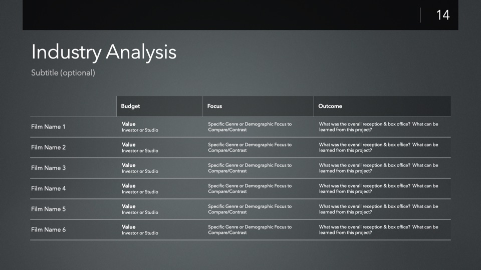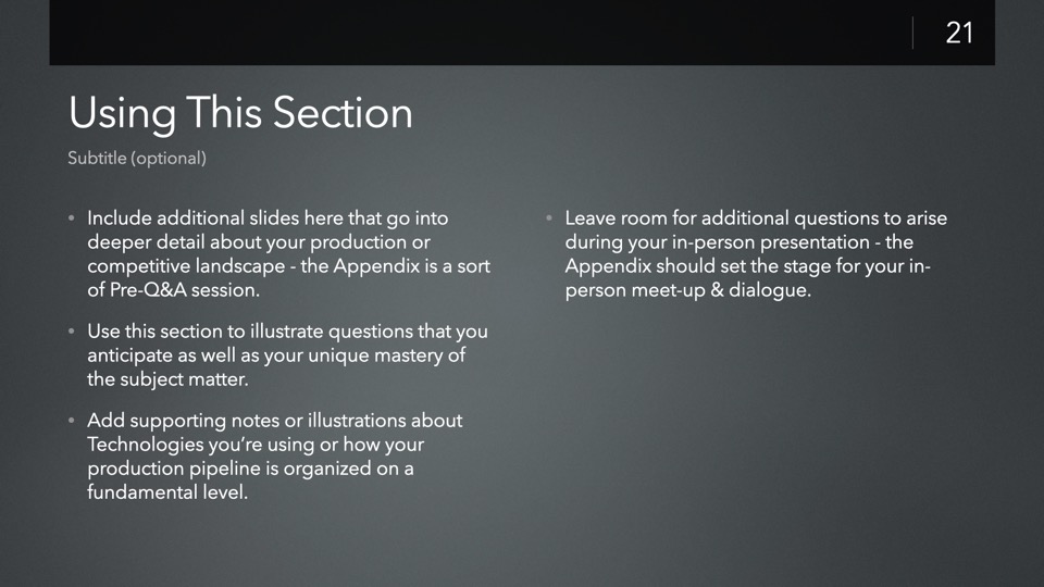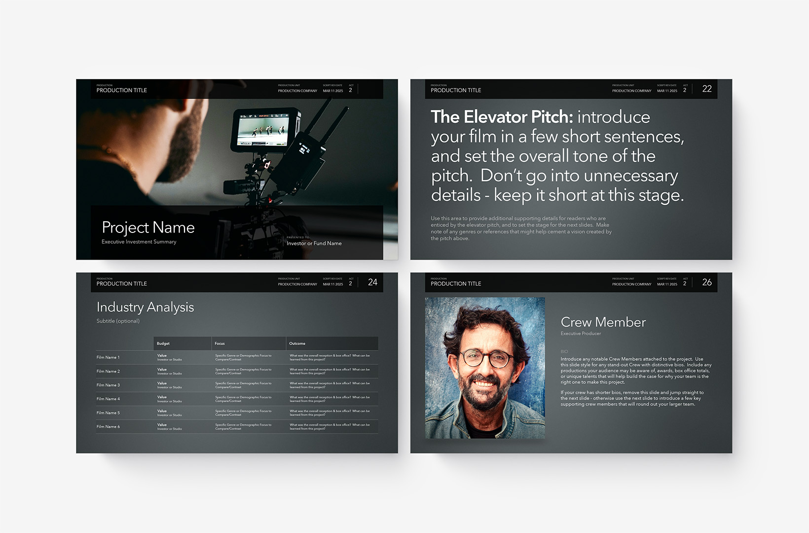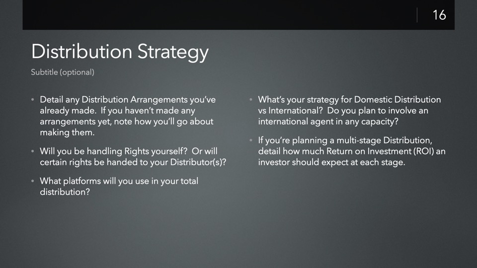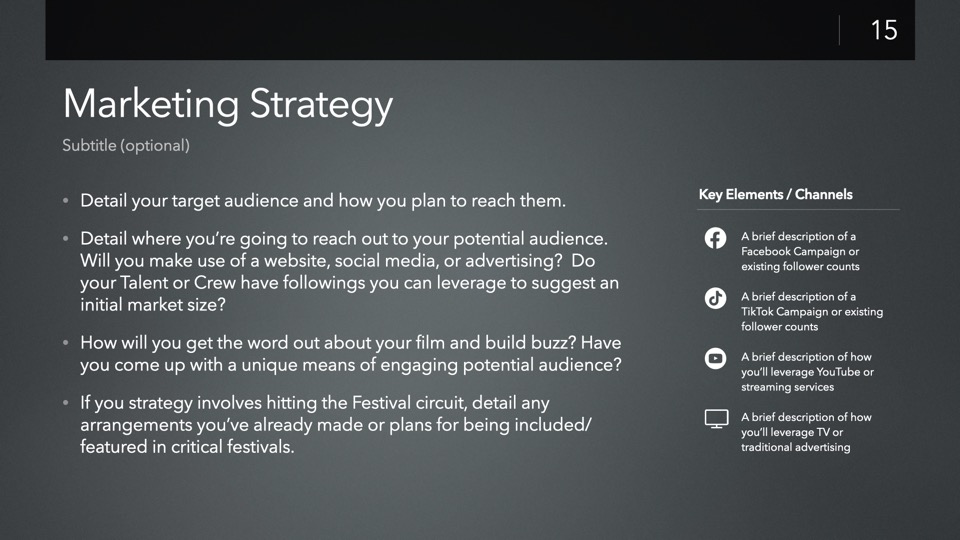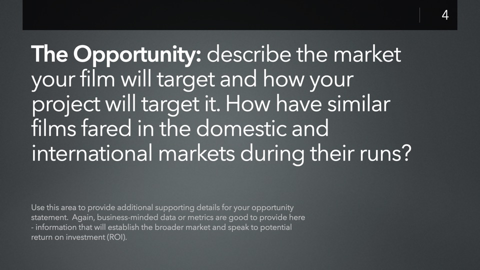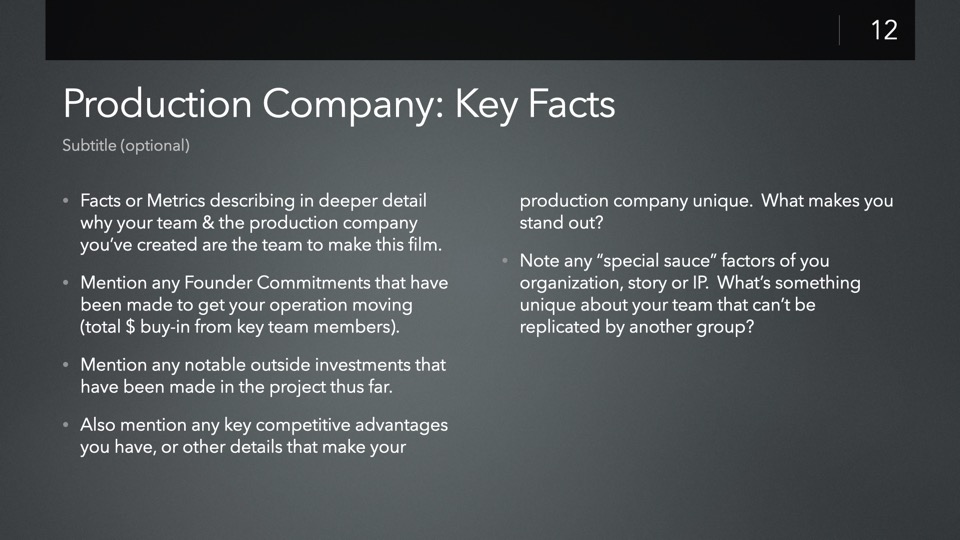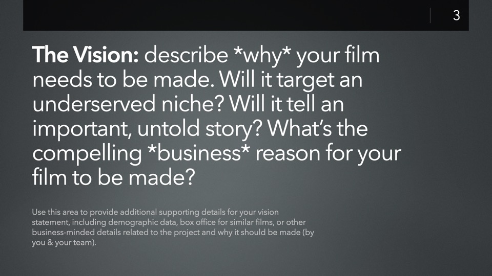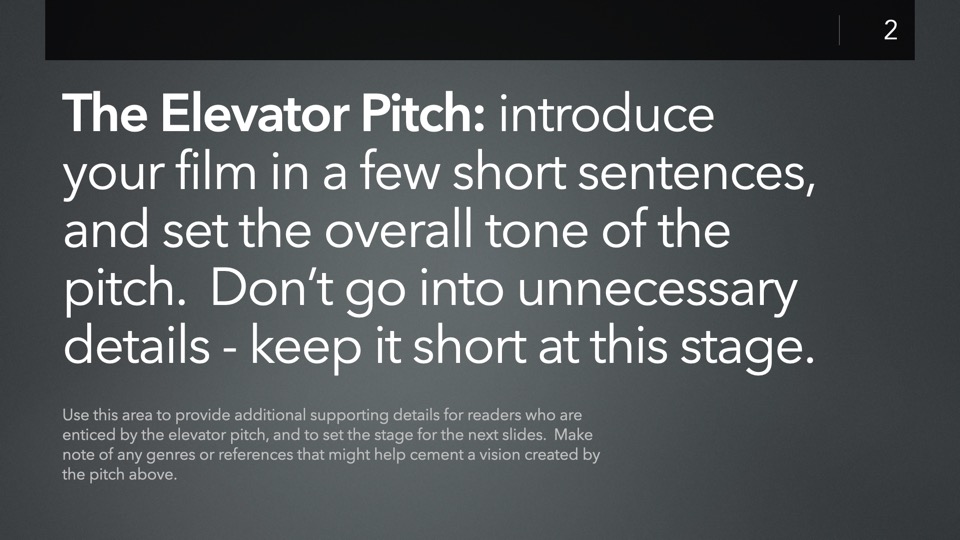 The JumpStart: Independent Film Investor Pitch template is designed to streamline the creation of a new Investor Pitch for your film - including a complete, structured presentation of pre-staged slides ready for you to customize to your own production, with tips & recommendations built into each slide to help guide you.