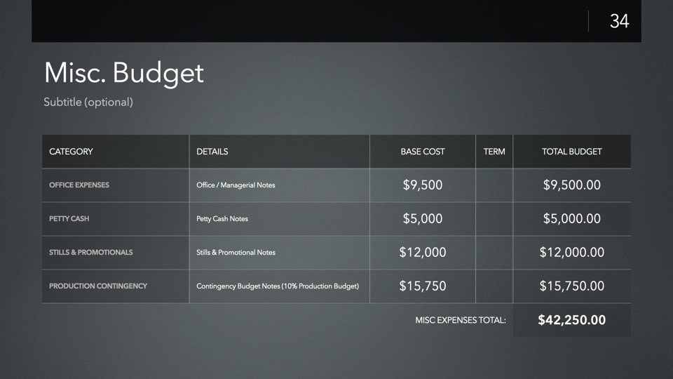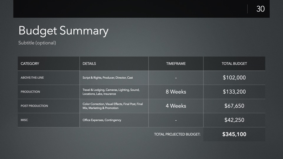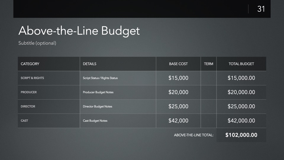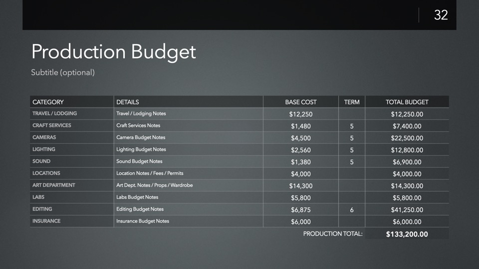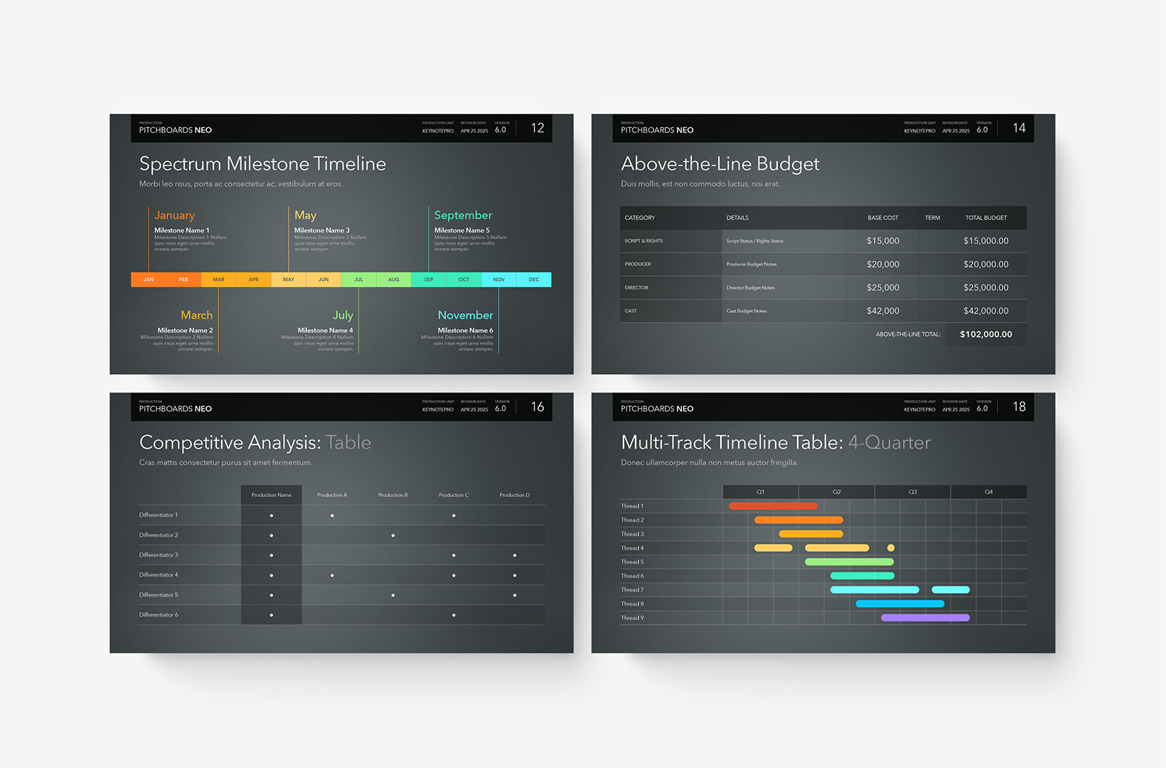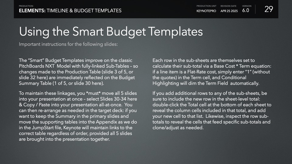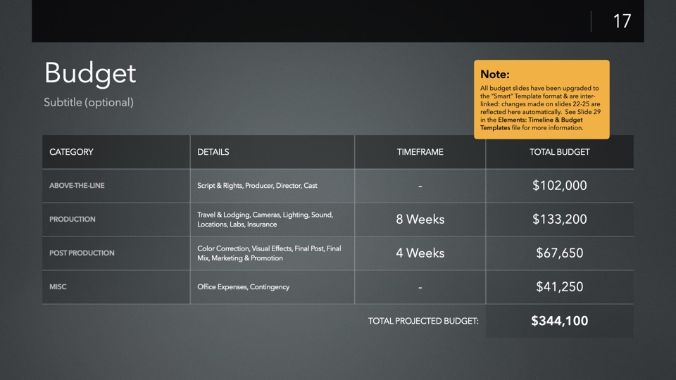 Timeline & Budget Table Templates includes multiple styles of Milestone Timelines, Multi-Track Project Timelines, and "Smart" Film Production Budget Table slides ready to Copy & Paste into your PitchBoards Neo presentations.