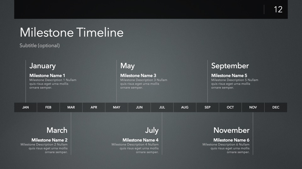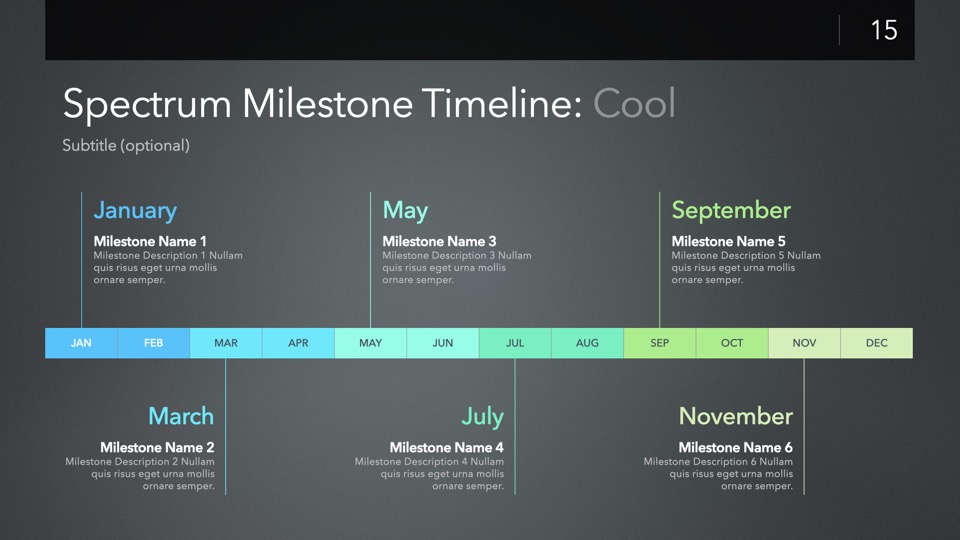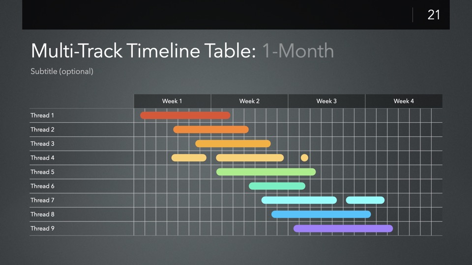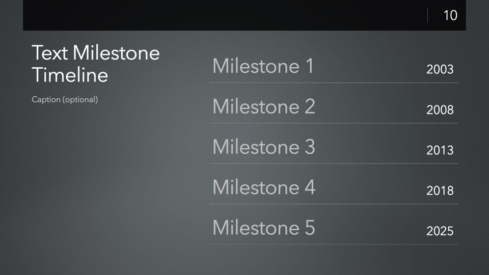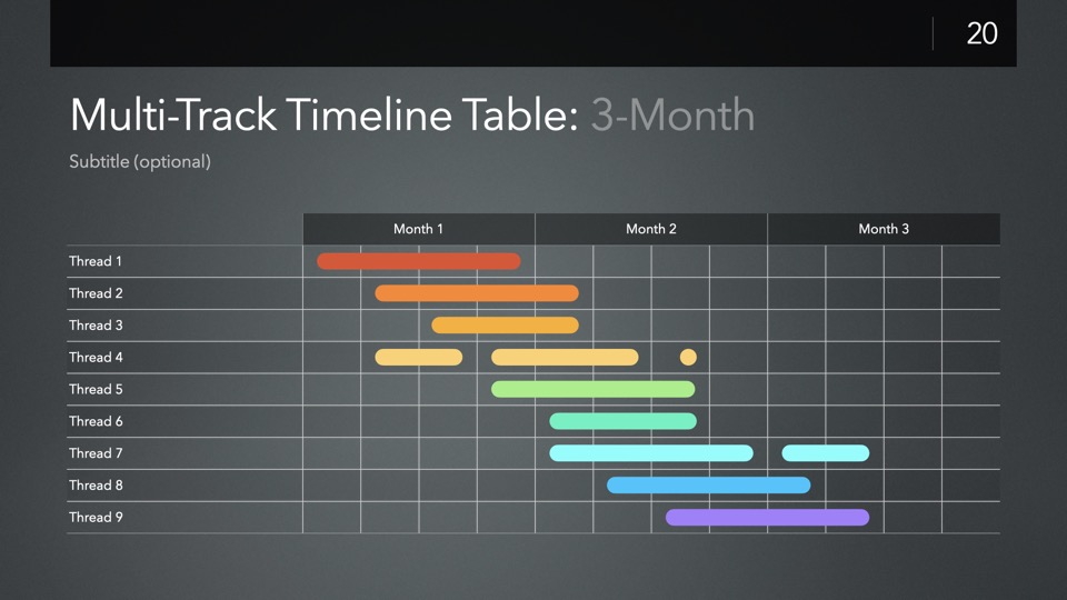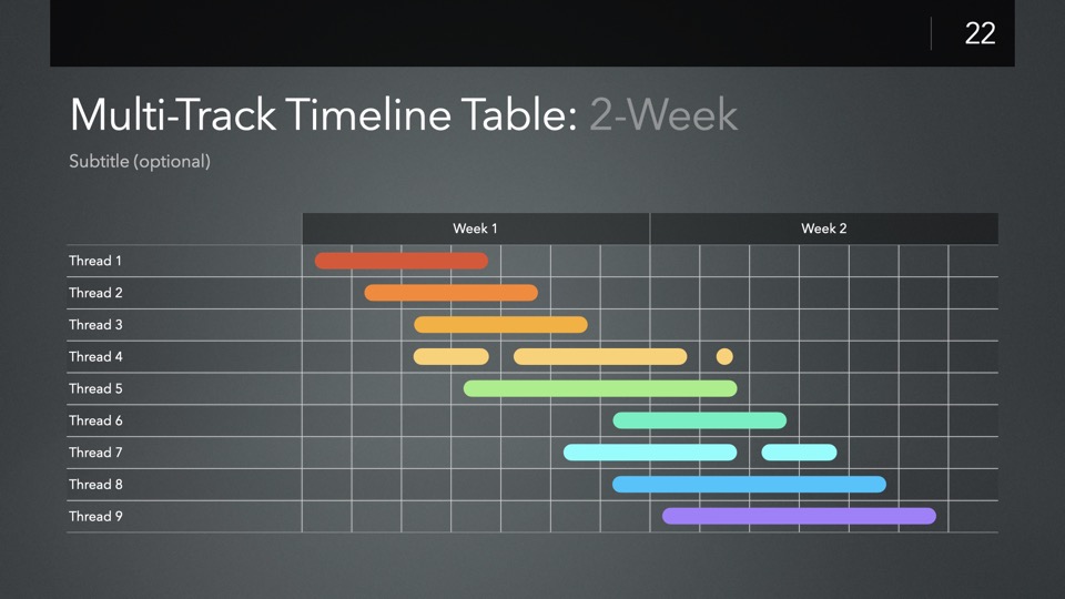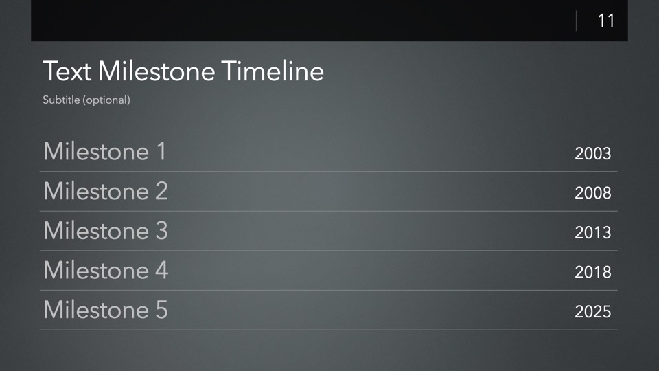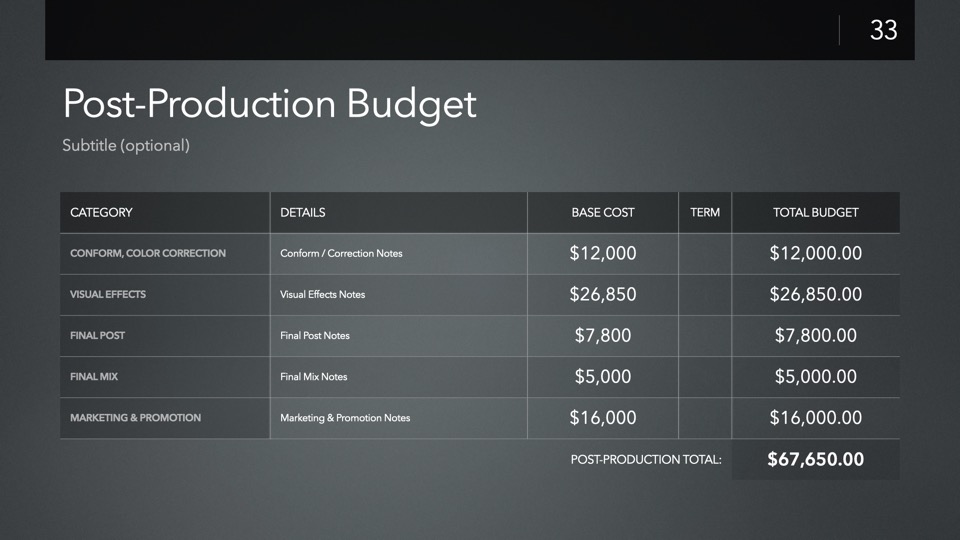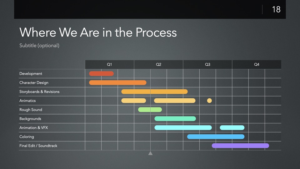 Timeline & Budget Table Templates includes multiple styles of Milestone Timelines, Multi-Track Project Timelines, and "Smart" Film Production Budget Table slides ready to Copy & Paste into your PitchBoards Neo presentations.