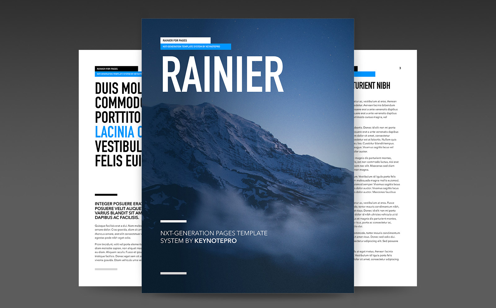 The Rainier templates for Pages, like their Keynote counterparts, were designed to be uniquely striking without sacrificing clarity or ease of use. Simple shape-based color accents cap a distinctive multi-tier, phased hierarchy set against a classically-informed editorial grid designed to maximize clarity and minimize distraction. The balance of restrained color & sturdy, modern type thrust your photos and textual content to center stage while maintaining unity, order, and cohesiveness throughout your entire document.