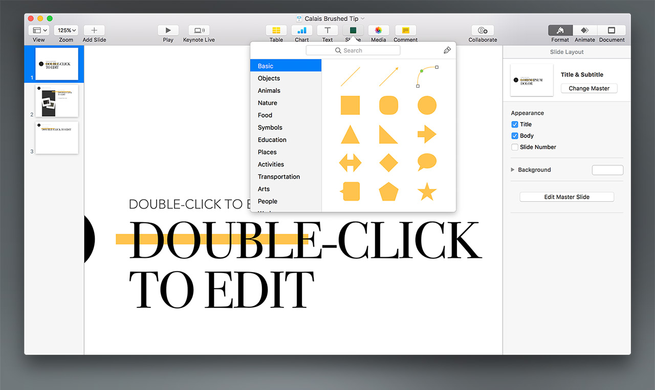 We can leverage that in Calais to apply one of the organic, brushed Line Styles to the Title Accent object & give it more of a hand-made feel throughout your entire presentation in just a couple of steps. These brushed shape styles are already defined for you in the Calais Supplemental file, but they're easy to set up if you want to follow along in the steps below.